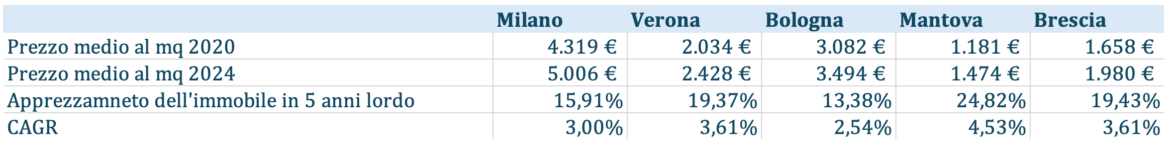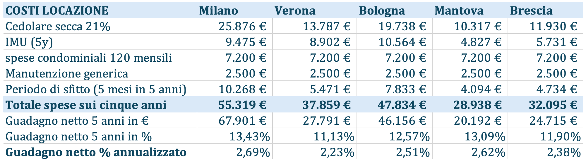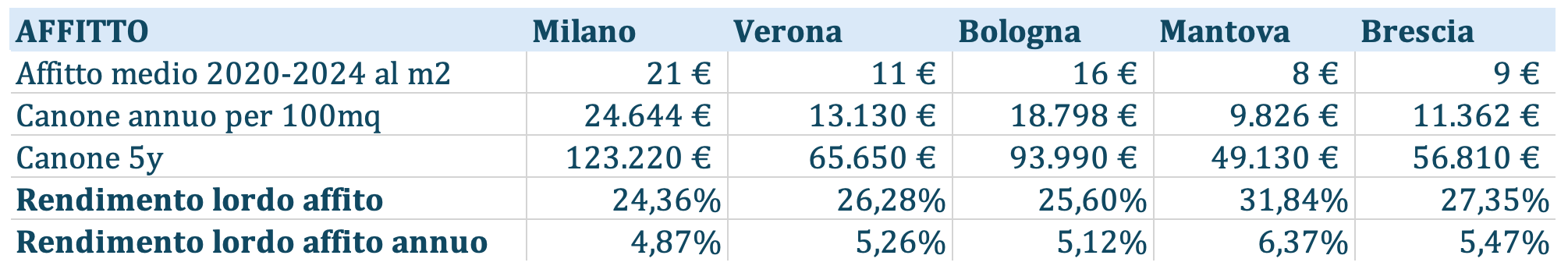 Sommando il rendimento netto da locazione e l’apprezzamento del capitale al netto dei costi di acquisto e di vendita, il rendimento complessivo annuo composto di un investimento immobiliare a Milano è circa l’1,89%, per Verona si attesta a +1,09%, Bologna +0,97%, Mantova +1,16%, Brescia +0,88%.