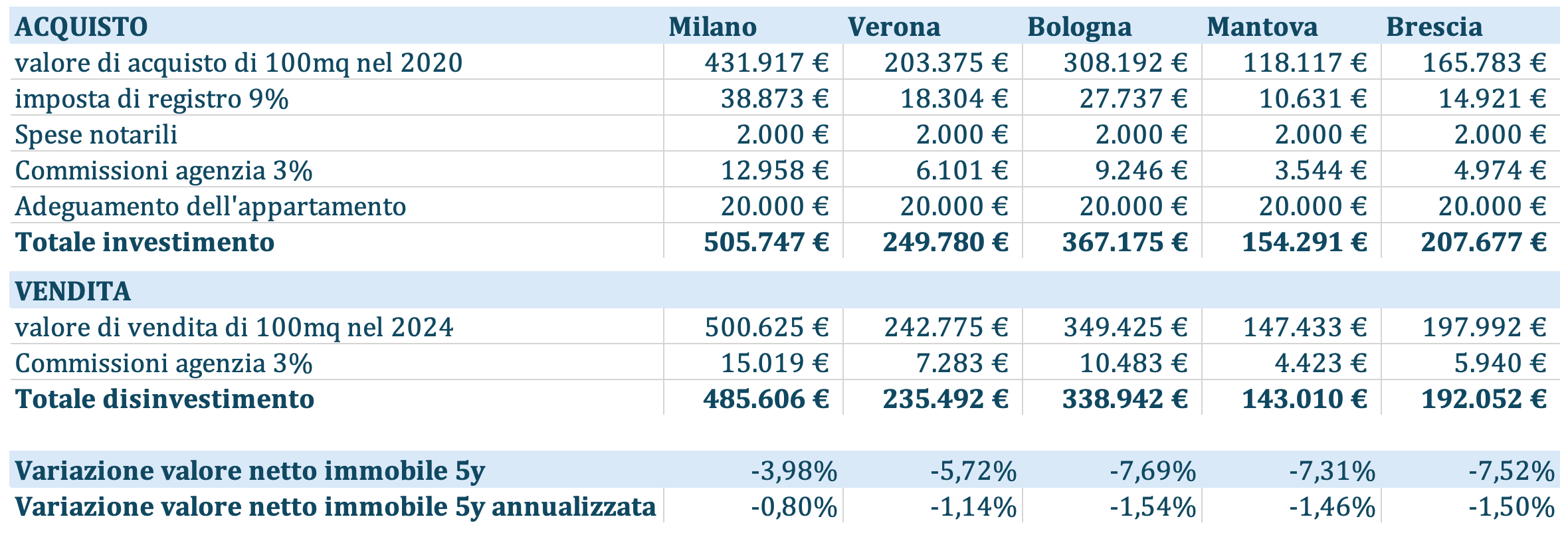 Osserviamo subito come il rendimento finale dell’operazione sia sempre negativo nonostante apprezzamenti al metro quadro di oltre il 13% su ogni città. Da notare, inoltre, che non stiamo considerando la tassazione sulle plusvalenze che andrebbe a deprimere ulteriormente il risultato.