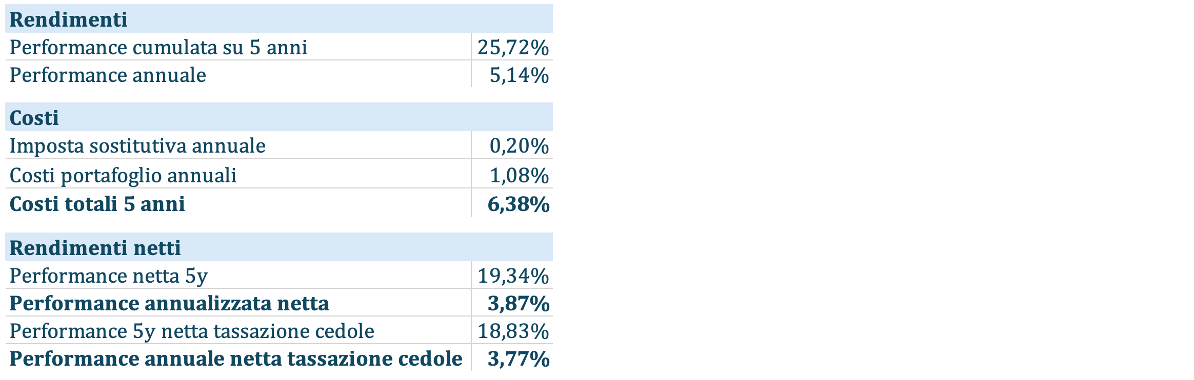 Abbiamo inoltre ipotizzato la presenza di cedole che abbiamo provveduto a tassare, al pari dei canoni di locazione, con un impatto sui cinque anni di circa lo 0,51% sul rendimento del portafoglio.
