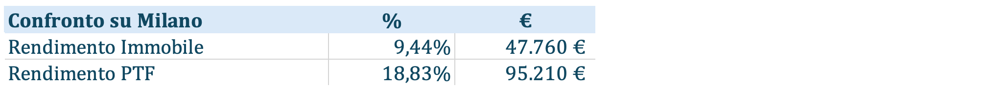 Riportiamo una tabella seguente una sintesi dei risultati ottenuti nell’analisi tra investimento immobiliare (esempio: Milano) e portafoglio finanziario su un orizzonte temporale di 5 anni: