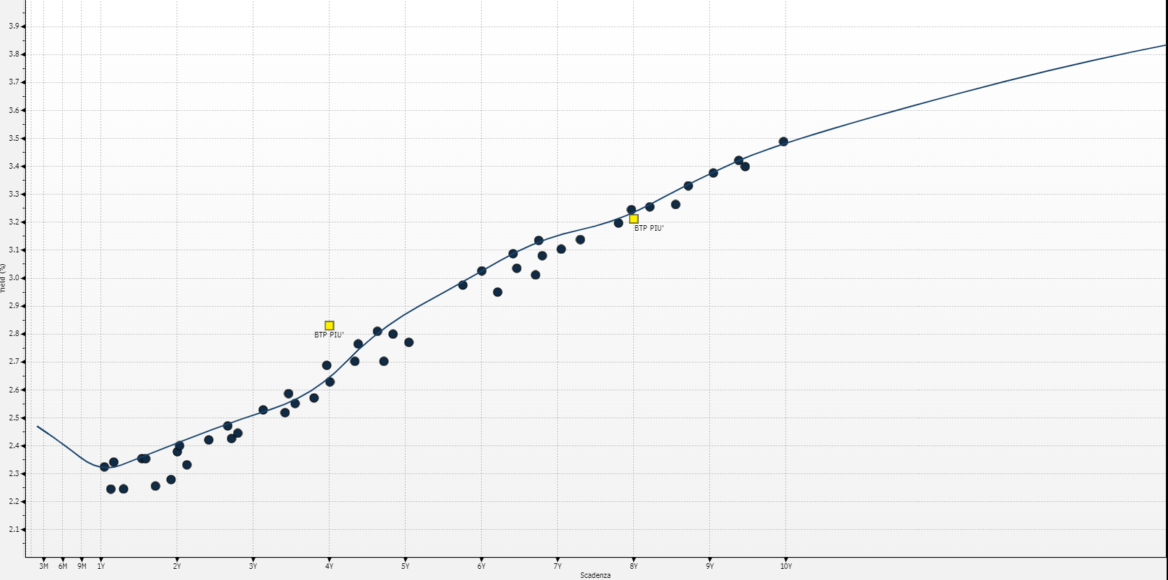 Grafico curva dei titoli di Stato italiani e Btp Più