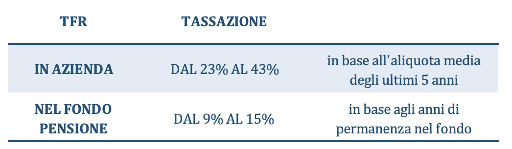 Nel caso in cui il TFR venga mantenuto in azienda la tassazione applicata varia tra il 23% e il 43%: viene applicata sulla somma totale liquidata un’aliquota pari alla tassazione IRPEF media degli ultimi cinque anni.